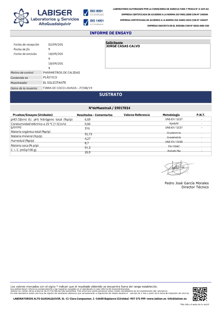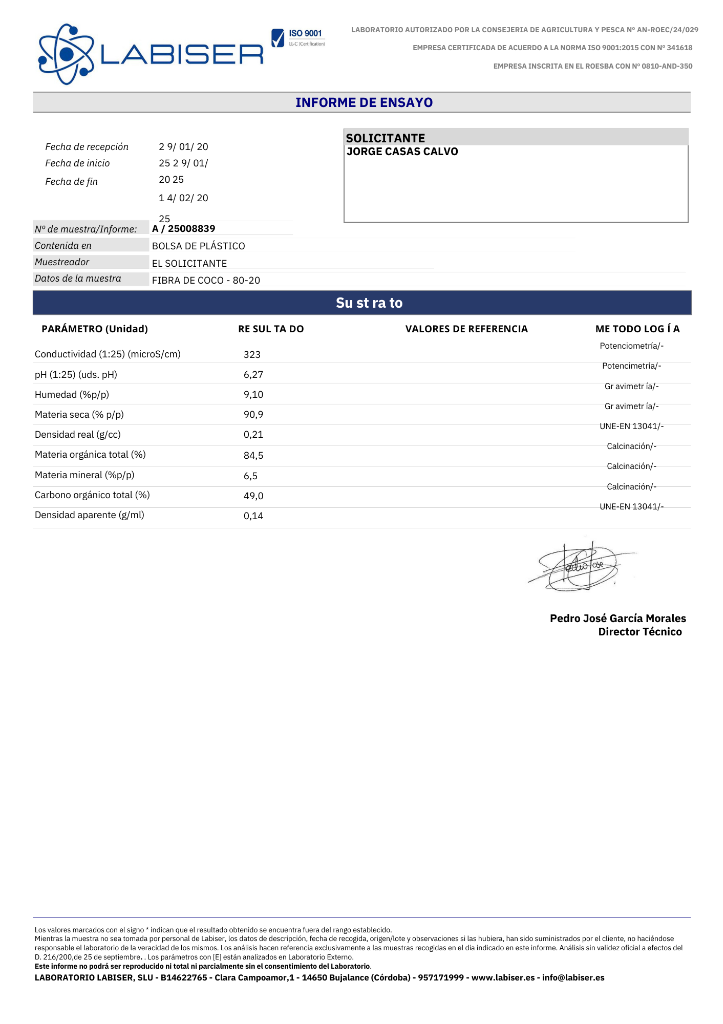 Análisis exhaustivo de las propiedades químicas y físicas del sustrato de cocopeat agrícola.